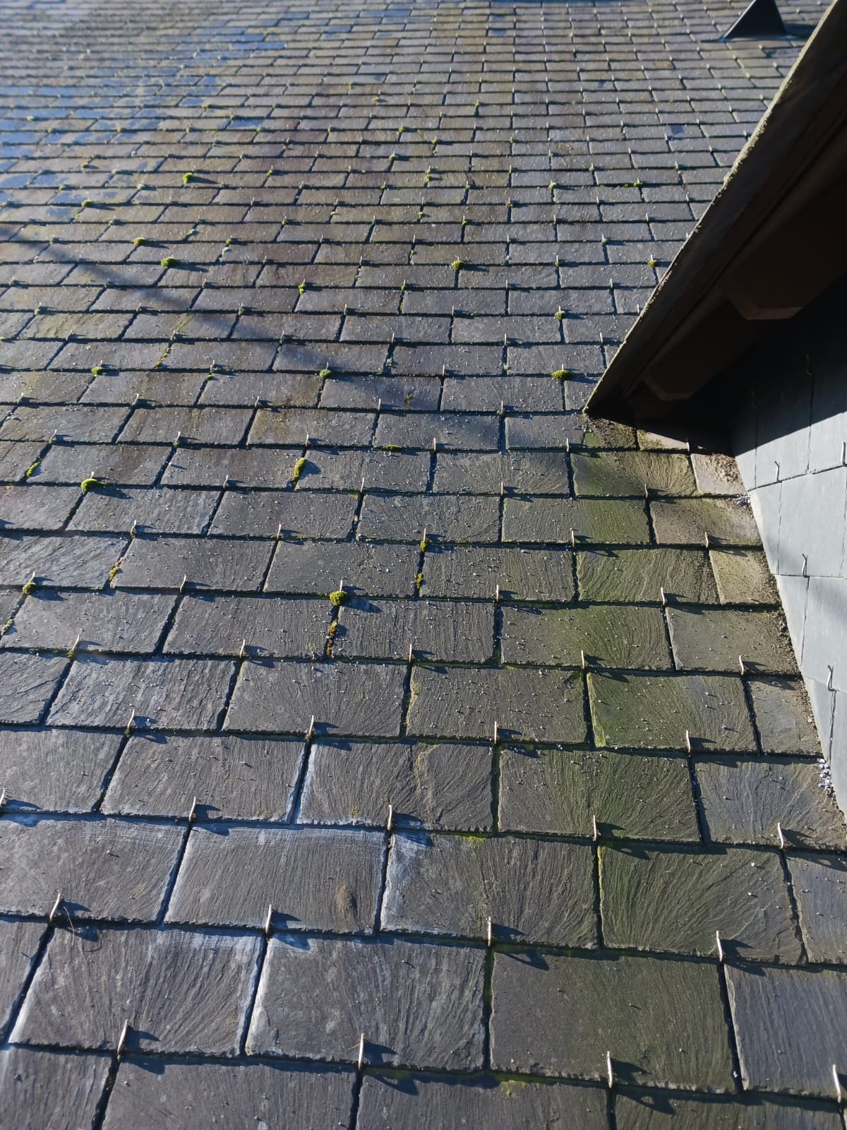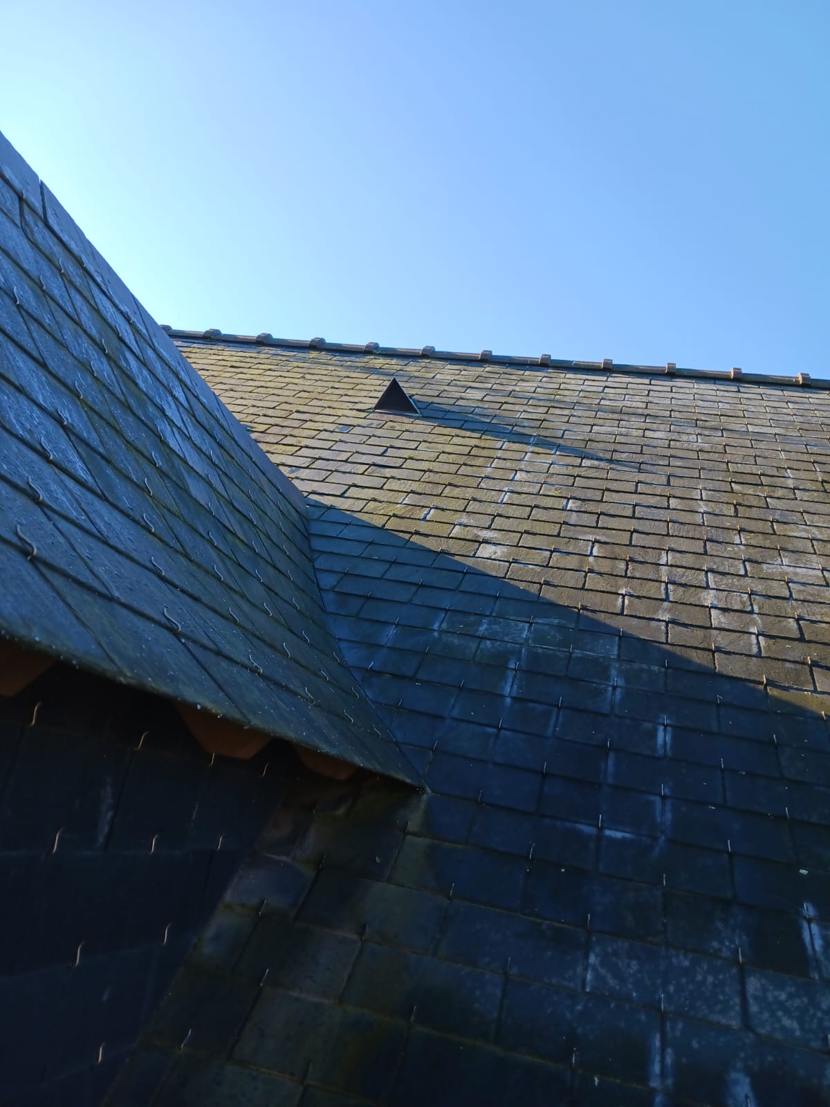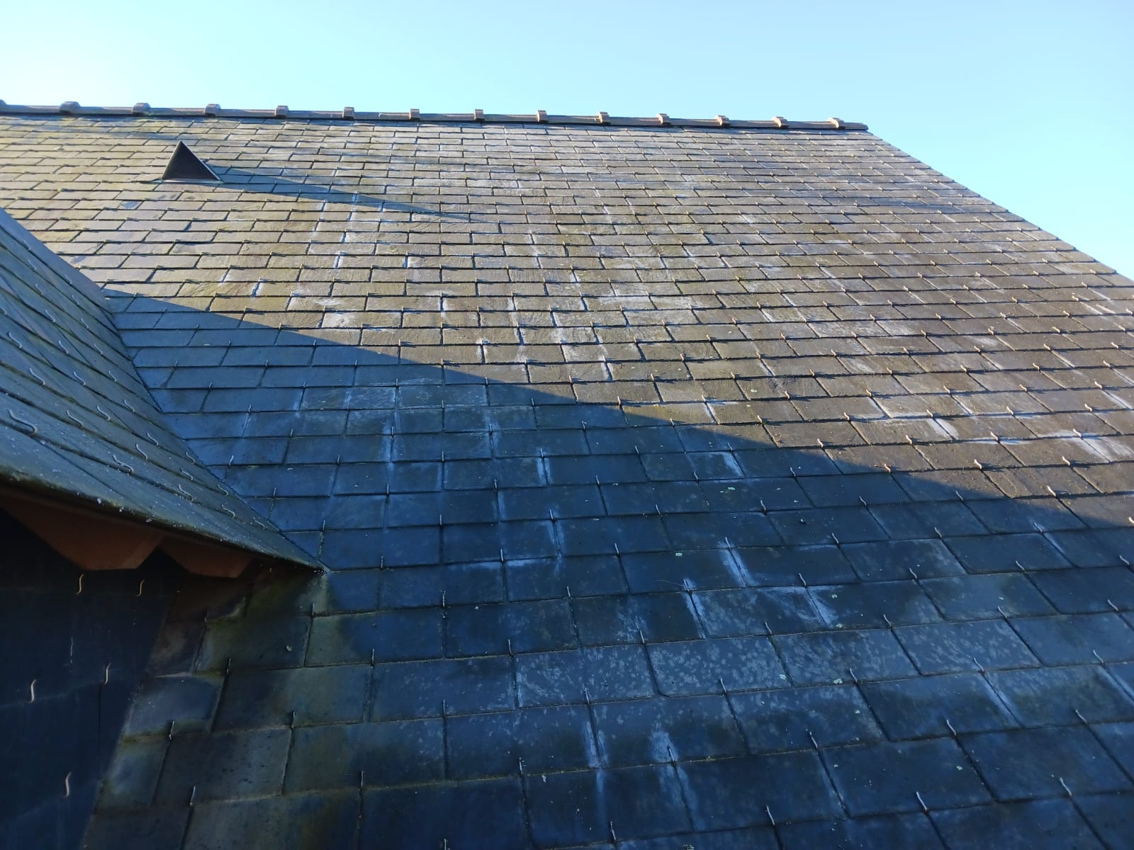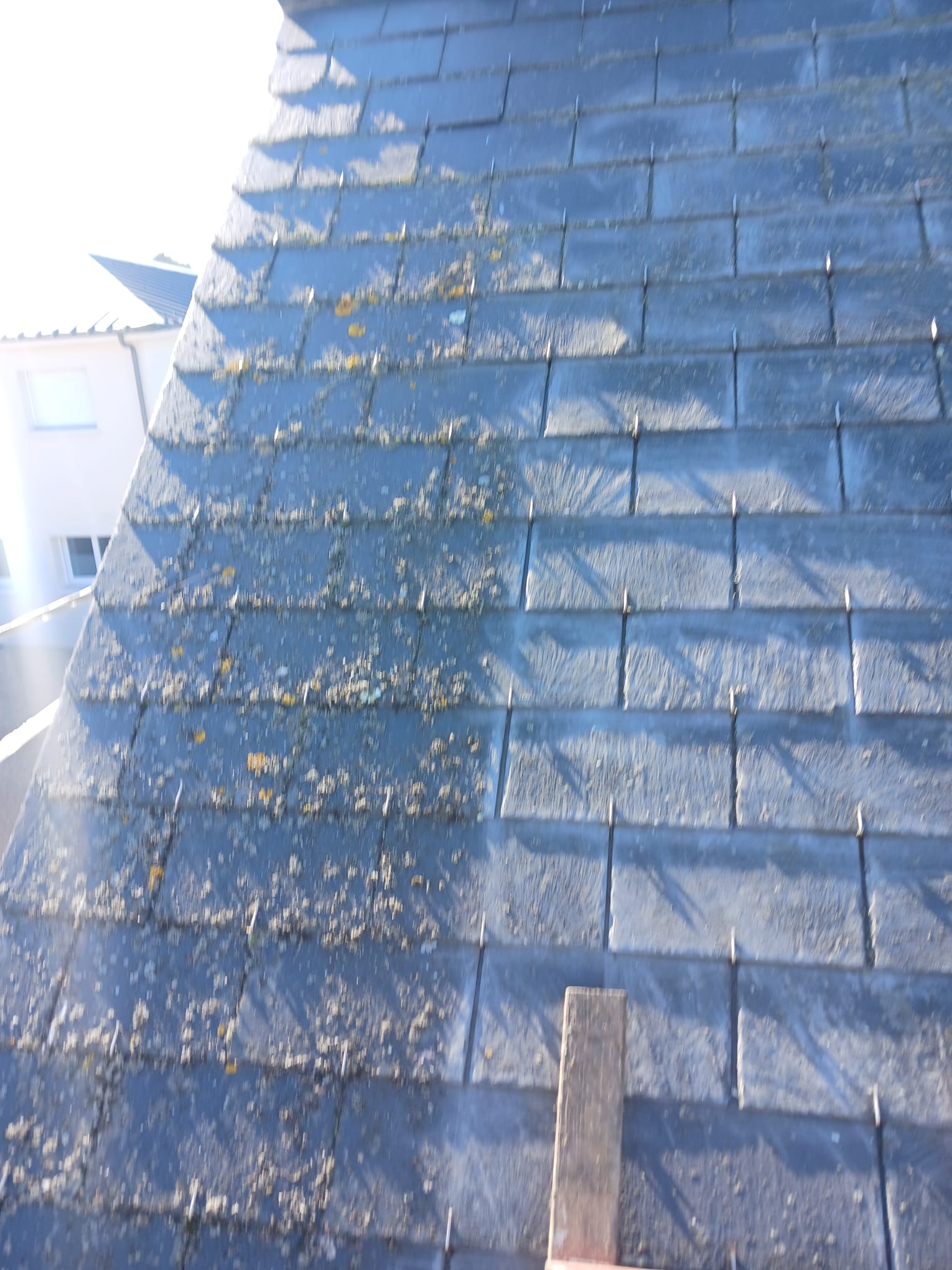 Nous avons récemment réalisé le démoussage complet d’une toiture à Angers. Pour ce chantier, notre intervention a consisté en un brossage minutieux des mousses suivi d’une pulvérisation d’un traitement anti-mousse.